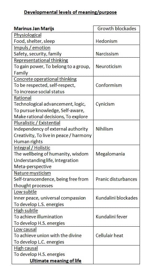 ‘Mystical development’ stands for a process in which a mystic transcends the personal and the rational domains to enter the trans-personal domains. It is directly related to the development of subtle energies that exist at different levels. During this process several growth blockades can appear, some of them are defense mechanisms. At the mystical levels one goes through stadia in which energetic blockades have to be removed (see figure 56 here below). From a mystical point of view, the Kosmos consists of different levels of existence. Alongside the physical there are different dimensions, different levels of consciousness. These dimensional levels are not spatially separated, but occupy the same space and mutually interpenetrate each other.