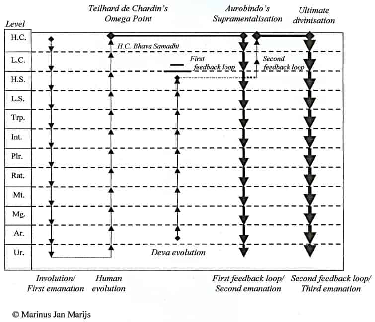 When the high causal level is activated to sublevel C, the process by Aurobindo called the Supramentalisation” starts. This causes that the (second) emanation/ involutionary force/’emanation stream’ (as mentioned earlier, it is still present during the evolutionary journey) becomes extraordinarily ‘charged’. The movement of the involutionary force all the way ‘down’ to the physical level, penetrates all levels with an unimaginably high activated energy. This process is named the “second Emanation” and the “first feedback loop”.