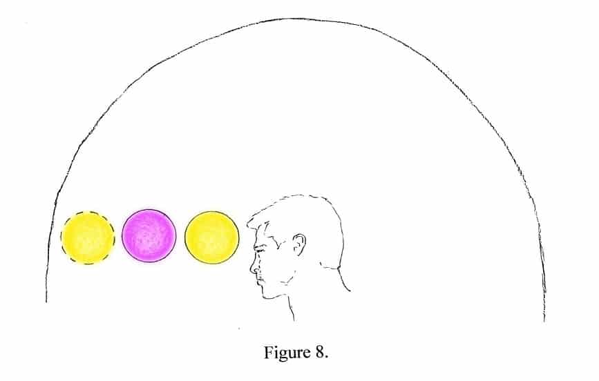 The time lapsing between two yellow orbs was still 4.7 seconds, as was the time between two violet orbs. Accordingly: yellow + 2.35 seconds, violet + 2.35 seconds, yellow… and so on. This alternation of the colored orbs is directly connected to the big yellow and violet nadis that crisscross each other at the center of the chakras in front of the body (see figure 37 ↓ ).