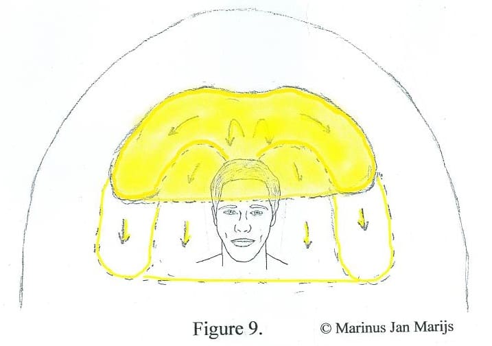 Going up to the next level, the yellow subtle energy no longer comes from the forehead chakra but from the crown chakra. This yellow subtle energy starts above the crown chakra and then slowly moves downwards till it reaches shoulder-height, where it dissolves, to be replaced by another wave of yellow subtle energy, starting above the crown chakra, and so on (see figure 9). Here also, the time lapsing between two waves of energy is approximately 4.7 seconds.