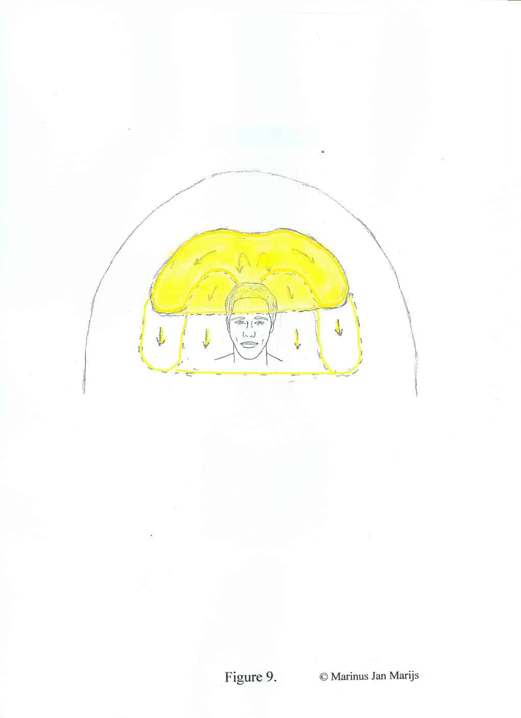 Going up to the next level, the yellow subtle energy no longer comes from the forehead chakra but from the crown chakra. This yellow subtle energy starts above the crown chakra and then slowly moves downwards till it reaches shoulder-height, where it dissolves, to be replaced by another wave of yellow subtle energy, starting above the crown chakra, and so on (see figure 9). Here also, the time lapsing between two waves of energy is approximately 4.7 seconds.